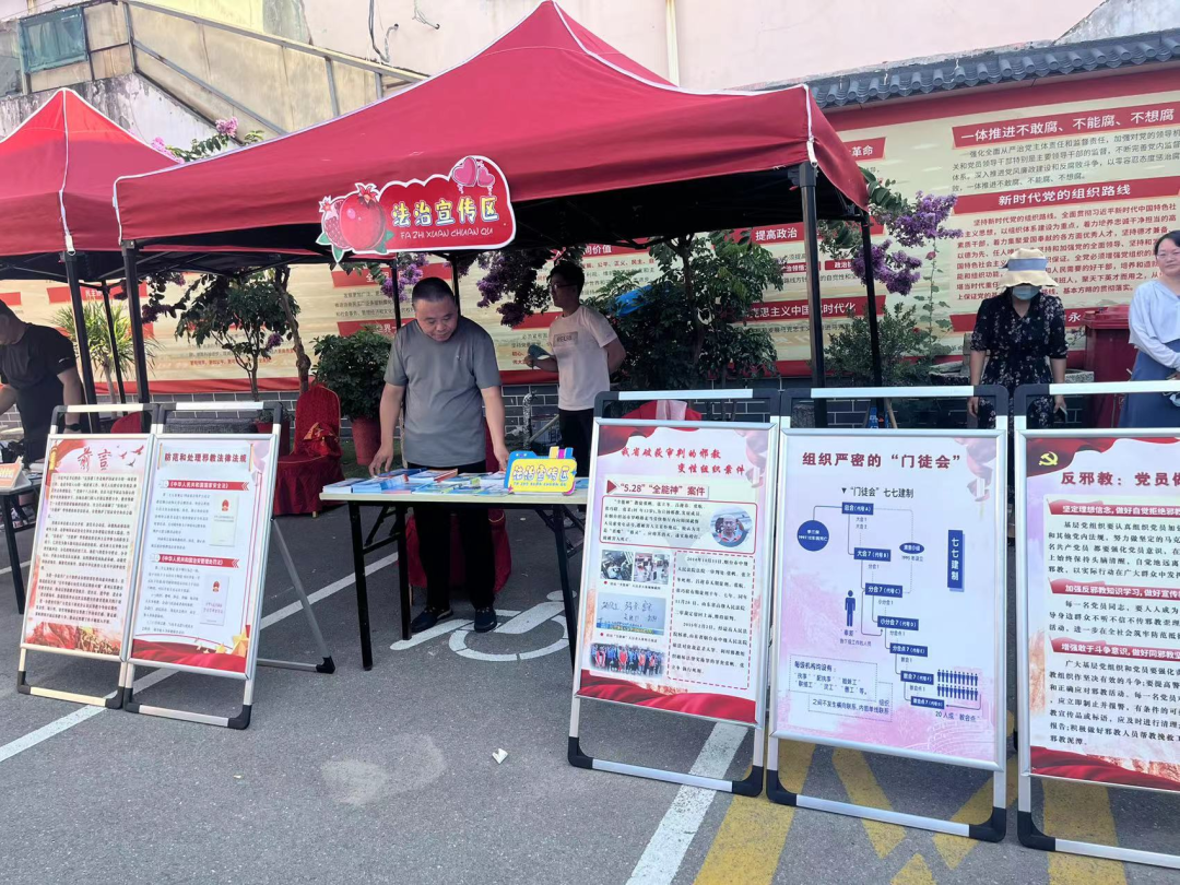 01 与党建融合 筑牢基层战斗堡垒 02 与信用融合 打造多维防邪格局 街道创新举办首届峄城区诚信公益集市,各部门工作人员组成志愿服务队走进集市。通过向群众发放反邪教宣传材料、反邪教展板、现场答疑解惑等多种形式,号召群众积极参与到防邪队伍中来,对歪理邪说“不听、不看、不信、不传”。活动中发放宣传材料2000余份、接待群众咨询60余人,形成了共管共治、常态长效的工作格局。 03 与网格融合 织密日常反邪防线 充分发挥网格员作为“基层反邪教第一道防线”的作用,将反邪教宣传融入网格员日常入户摸排、走访、回访工作中,与群众面对面宣传讲解邪教的危害性,提醒群众要认清邪教的传播形式,告知反邪举报方式,引导鼓励广大群众积极踊跃检举邪教违法犯罪线索,配合公安机关严厉打击各类邪教组织违法犯罪活动,进一步提升居民群众的自我防范意识和反对邪教的自觉性。 04 与法治融合 强化宣传阵地建设 街道在徐楼、仙坛等社区打造法治文化宣传一条街,制作反邪教相关宣传板牌50余块,普及《治安管理处罚法》、《刑法》、《民法典》、《反有组织犯罪法》等相关的法律法规,形成浓厚的法治文化氛围,营造“零距离”普法环境,使居民群众自觉遵法、学法、守法、用法,不断增强群众法治观念,提高“识邪、防邪、拒邪”意识。 下一步,坛山街道将持续深化反邪教宣传教育工作,把反邪教工作纳入重点工作事项,压实主体责任,切实引导辖区群众增强辨邪、防邪、反邪能力,为平安坛山建设营造更加和谐、健康、稳定的社会环境。