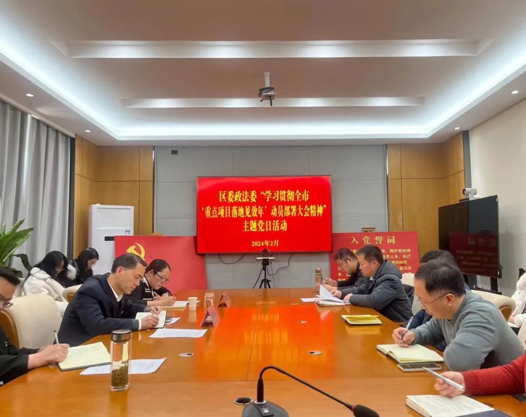 学习贯彻 全市"重点项目落地见效年"动员部署大会精神 主题党日活动 会上,重点传达了区委书记张熙滨同志在全区转作风提效能强项目促发展动员部署大会上提出的要求,部分同志就如何落实会议精神结合业务工作进行了表态发言。 会议要求,一是解放思想、勇争一流。要对标先进、奋勇争先,以一流目标、一流标准、一流状态推进政法和社会治理各项工作。二是攻坚克难,真抓实干。坚持目标导向和问题导向,突出风险化解、诉求办理、网格管理、治安防控等工作重点,强化措施,持续发力,形成常治长效的良好工作局面。三是练好内功、提升本领。要以巩固提升”峄法有为“党建品牌建设为抓手,“练实基本功、练出好作风、练成多面手”,打造忠诚干净担当的政法铁军,为全区经济社会高质量发展提供坚强政法保障。