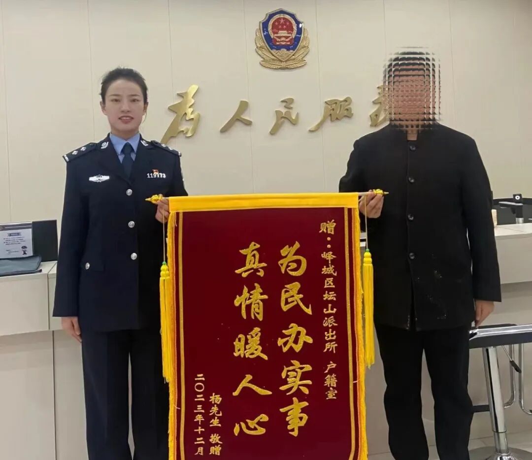 12月11日,杨先生将一面印有“为民办实事 真情暖人心”的锦旗送到坛山派出所户籍窗口,感谢民警为其更正年龄一事。
