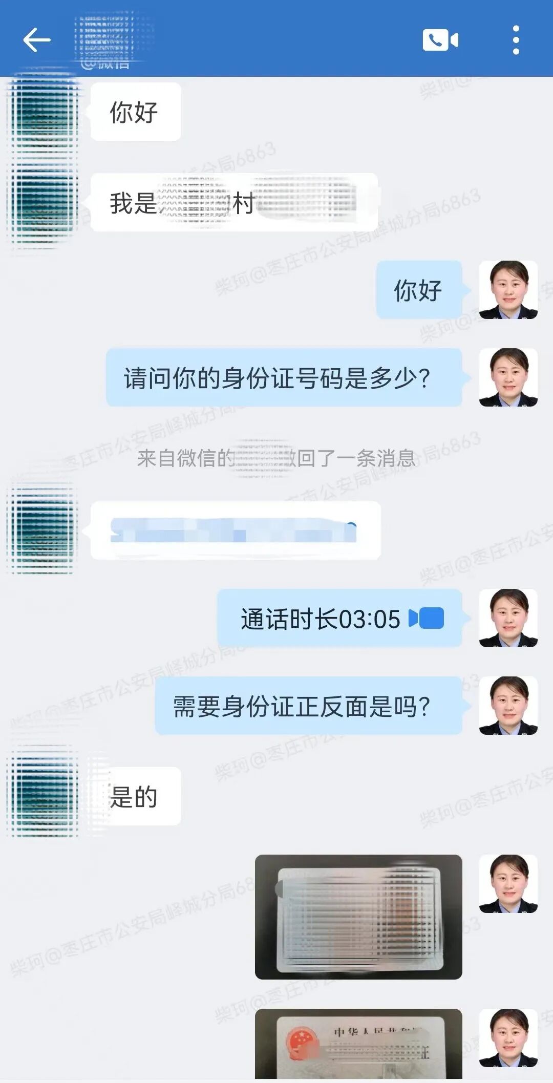 近日,古邵派出所户籍室接到古邵镇某村村民王某的电话,询问自己新的身份证是否办好,因为报考资格证书,报名时需要上传身份证照片,但之前办证时只考虑到不耽误考试,办理的慢证,没想到将会耽误报名。更困难的是,王某现在在外地,不方便回家,便寻求民警帮助。得知这一情况,户籍民警立即查询系统,发现王某的身份证刚刚办理完成送达窗口,当即让群众添加了自己的政务微信,通过视频连线,确认其身份信息后,将身份证的正反面拍照发给了王某,确保王某成功报名考试。