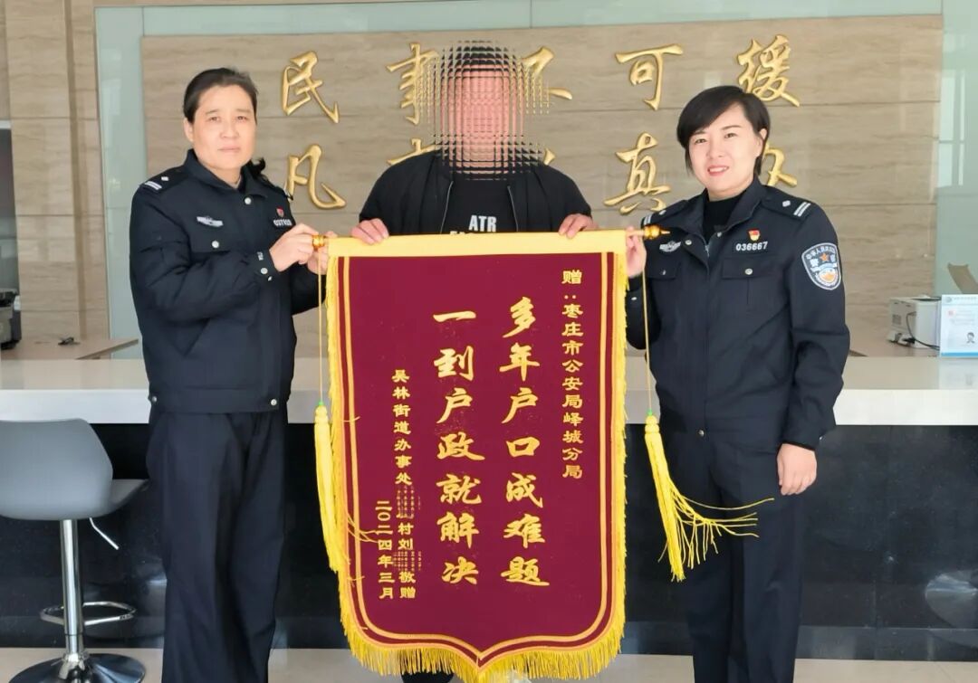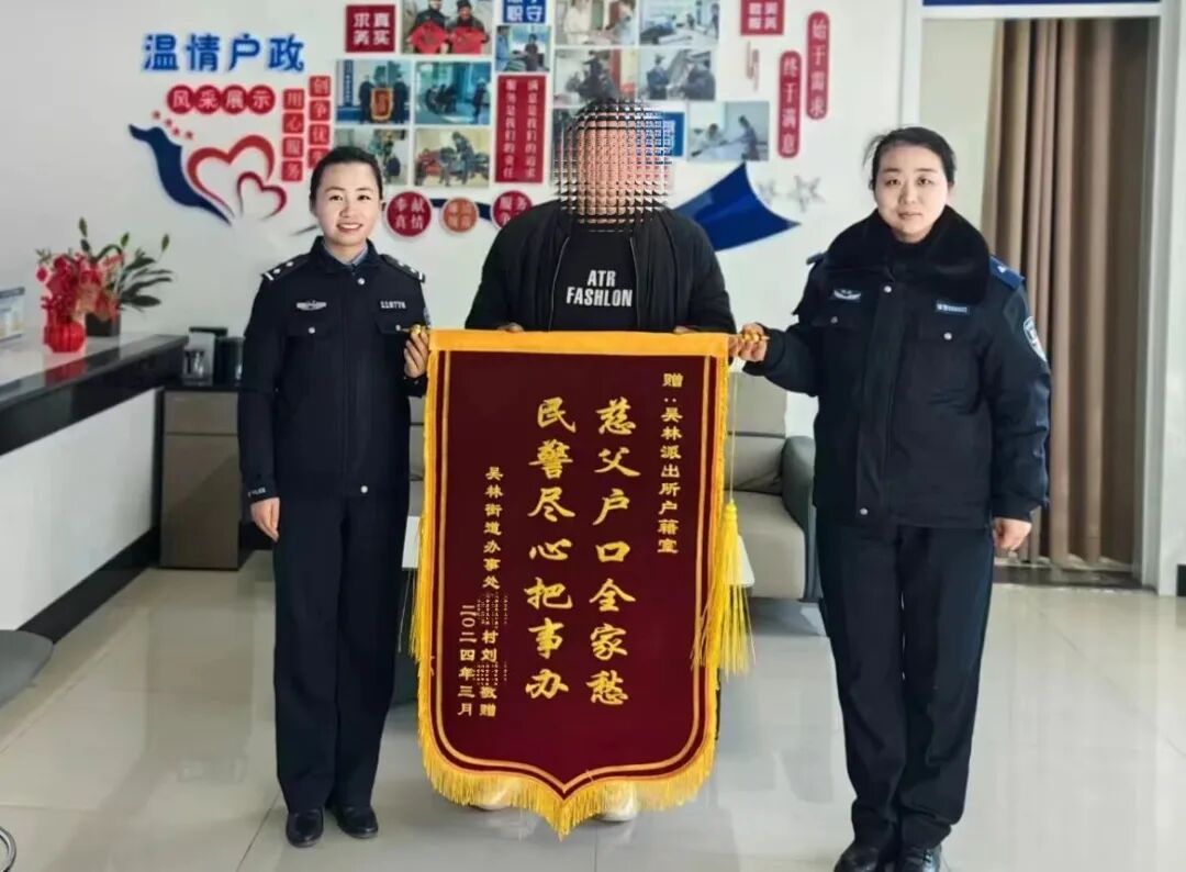 3月20日,吴林街道群众刘先生将一面印有“多年户口成难题 一到户政就解决”的锦旗和一面“慈父户口全家愁 民警尽心把事办”分别送到了分局政务服务中心和吴林派出所户籍室民警的手中,感谢民警帮助其父亲解决困扰多年的户口问题。